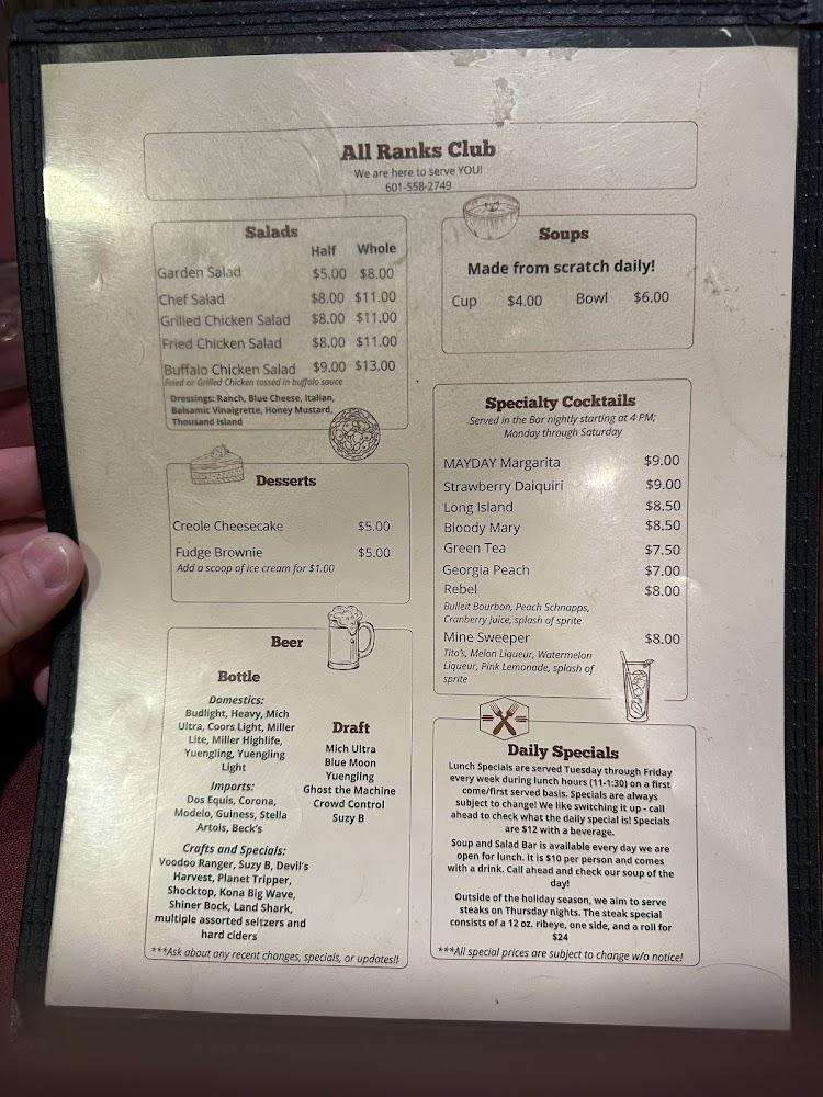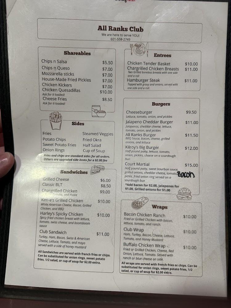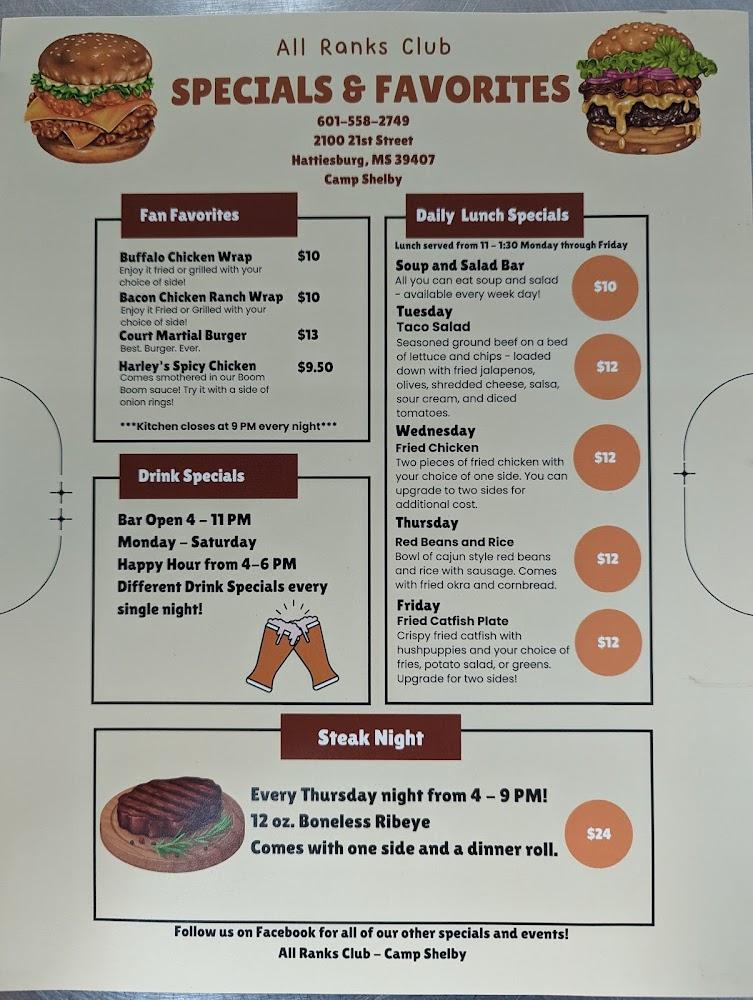 Welcome to the Camp Shelby All Ranks Club, your go-to spot in Hattiesburg for great food, refreshing drinks, and lively entertainment! Open every weekday for lunch with tempting daily specials, our bar and grill serves delicious meals from Monday to Saturday, ensuring there’s something for everyone. Enjoy a fun-filled atmosphere with karaoke every Friday night and fantastic drink specials throughout the week. We also cater to special events, from promotions to weddings, allowing you to celebrate in style. Join us at 2100 21st St, and experience the camaraderie and fun! Call us at +1 601-558-2749 to learn more.